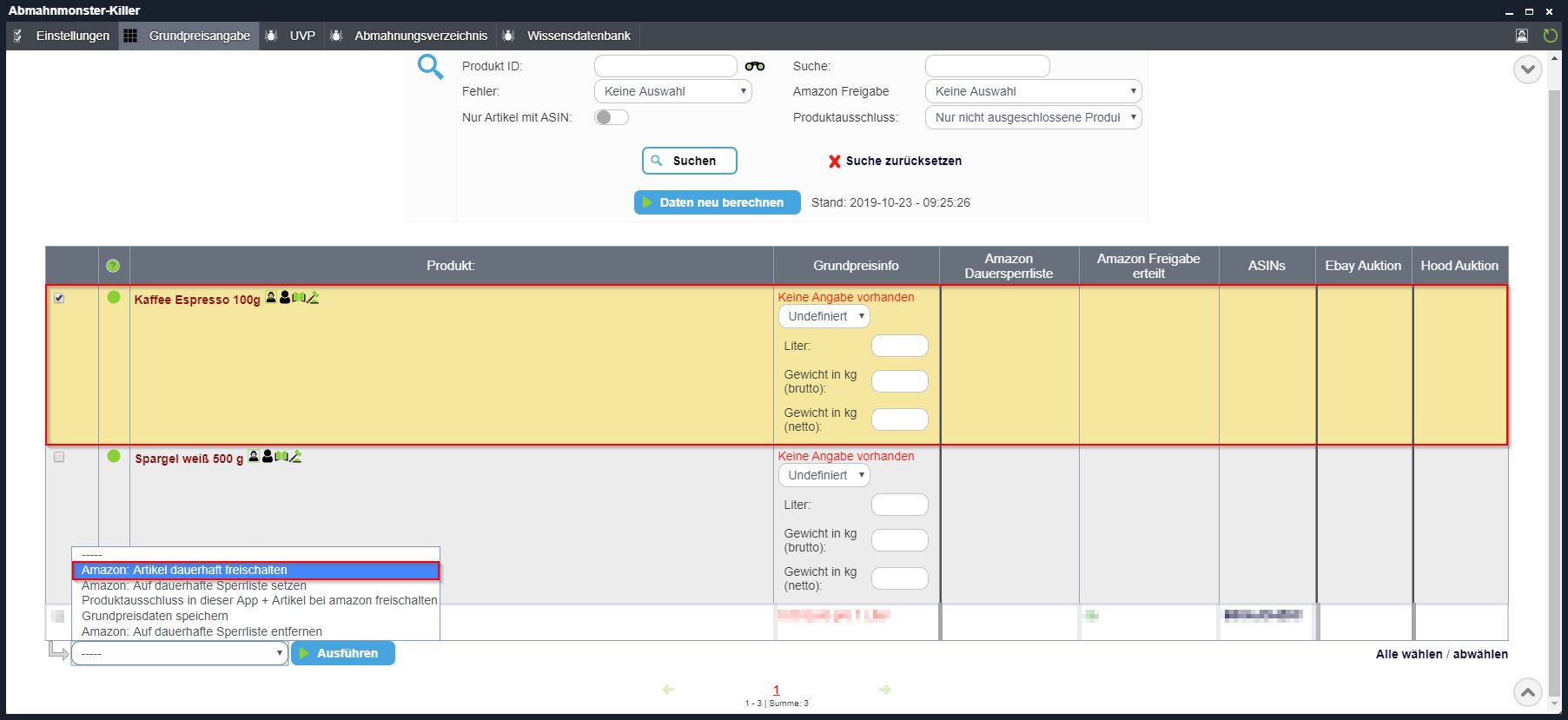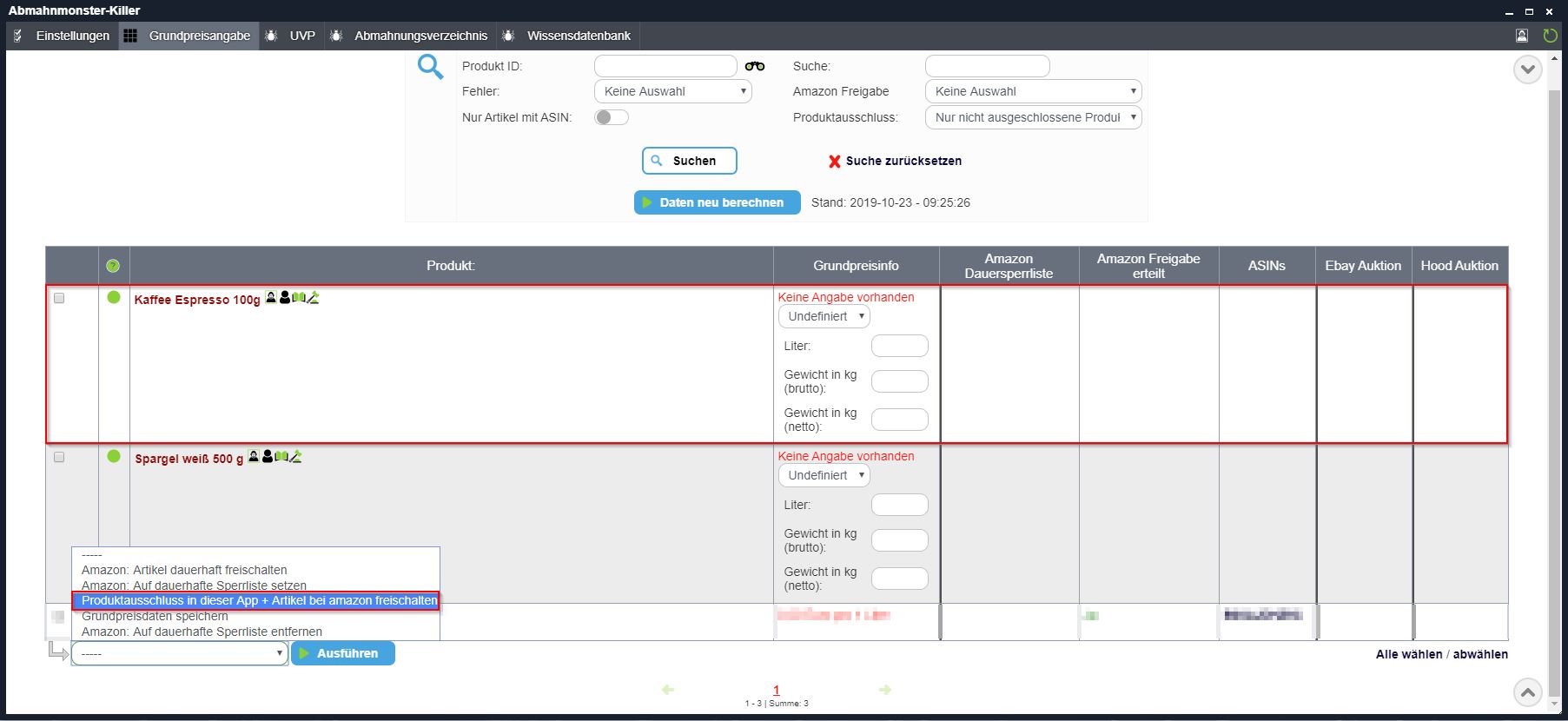 Ein weiteres Tool der Software betrifft die Massenverwaltung. Sie kann die Abmahn-Gefahr verringern, indem die Grundpreisangaben bei Amazon leicht und einfach zu kontrollieren ist.